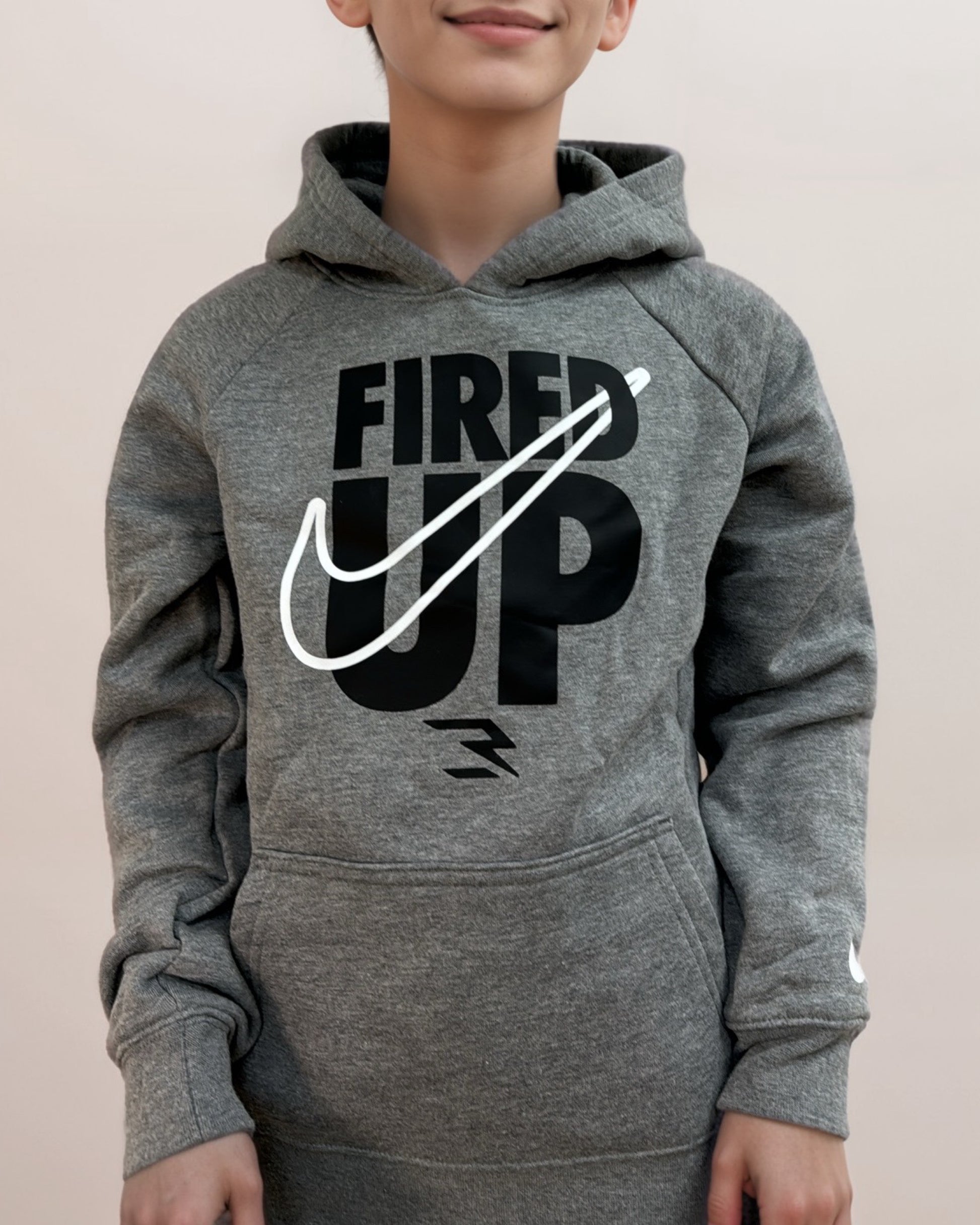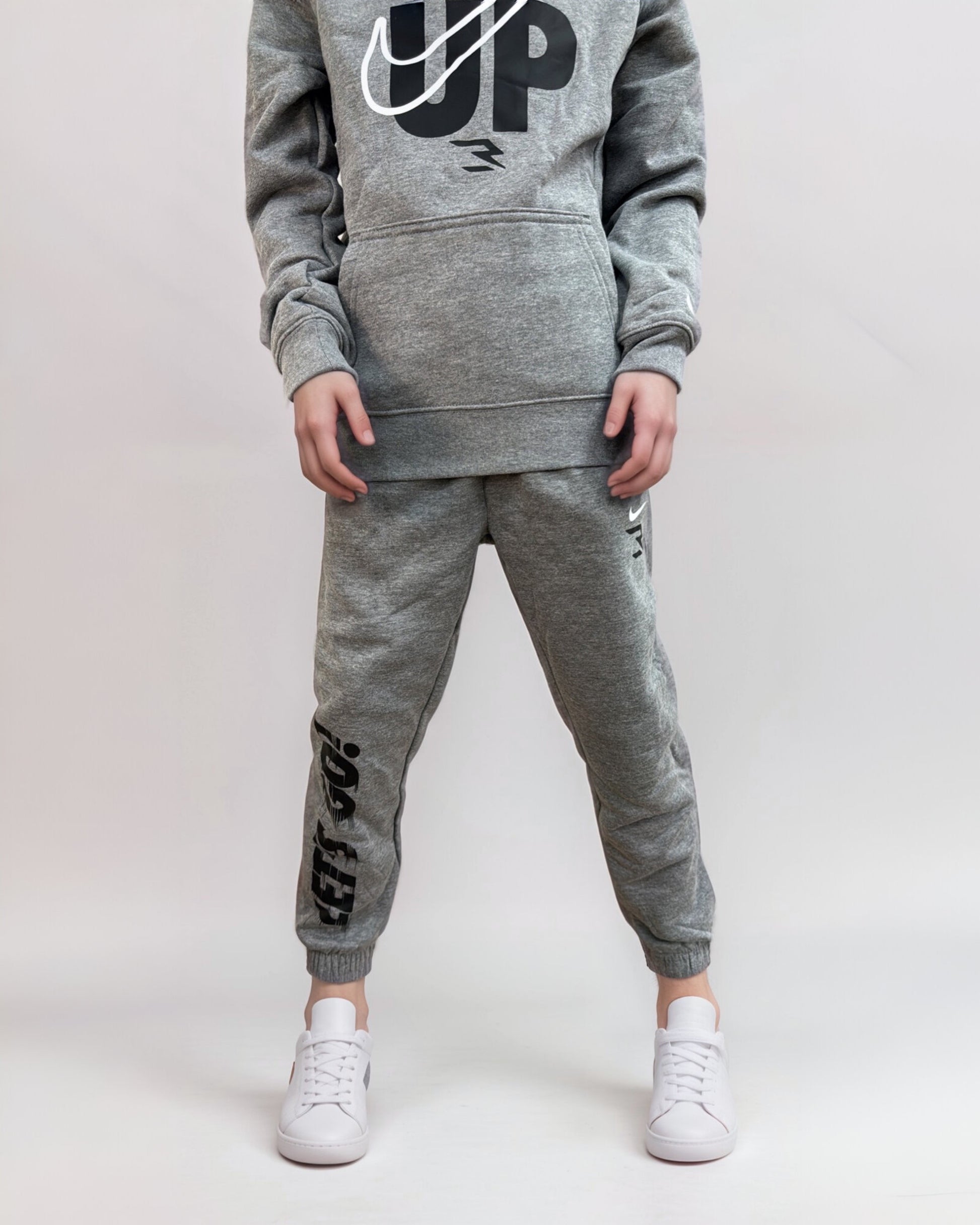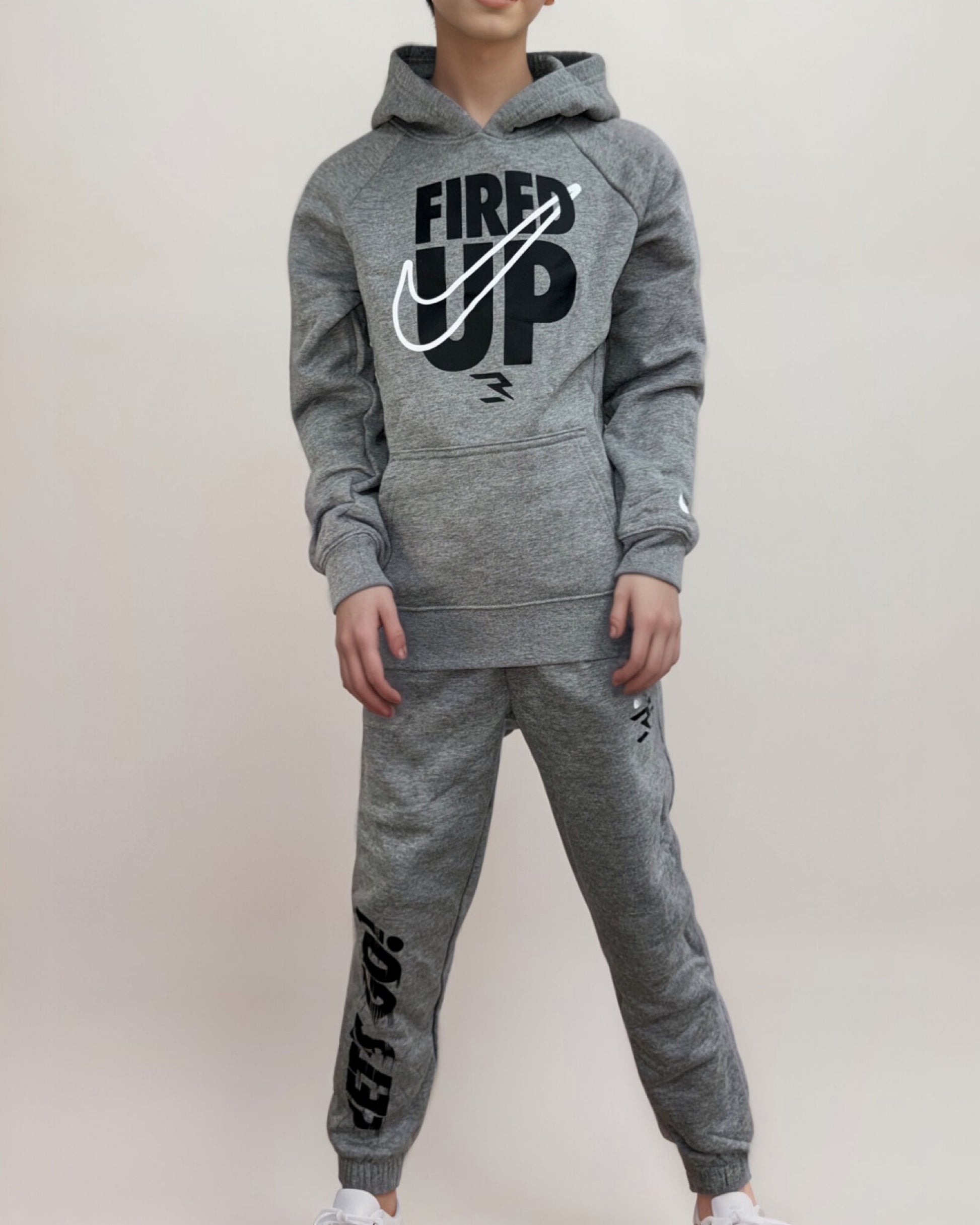 תיאור: סט שתי חלקים לנערים עם לוגו של נייק וכיתוב ״Fired Up” ומכנס עם כיתוב באזור הרגל ״Let’s Go”.